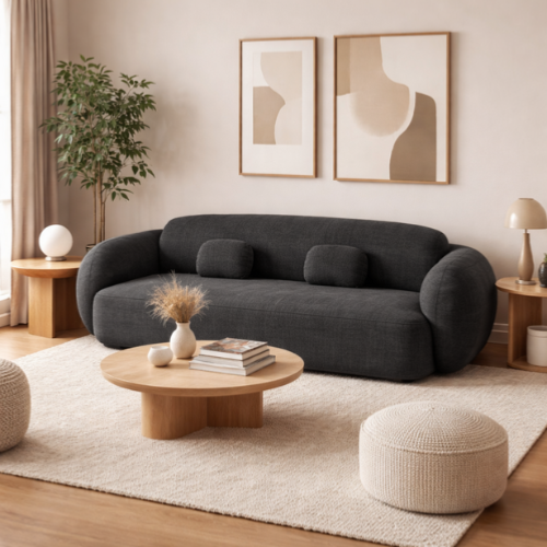 Le canapé 3 places Bulane en tissu texturé gris anthracite séduit par son design sobre et sa texture chaleureuse. Parfait pour créer une ambiance contemporaine, il combine confort et solidité grâce à son rembourrage moelleux et sa structure en bois massif certifié FSC.