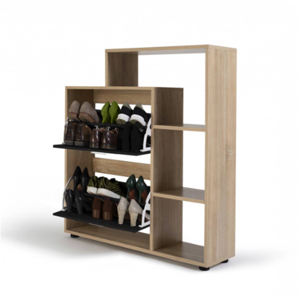 Ses tiroirs basculants offrent un rangement pratique et astucieux, pouvant accueillir environ 6 paires de chaussures par compartiment, tandis que les étagères ouvertes sur le côté permettent de disposer vos accessoires ou objets décoratifs.
