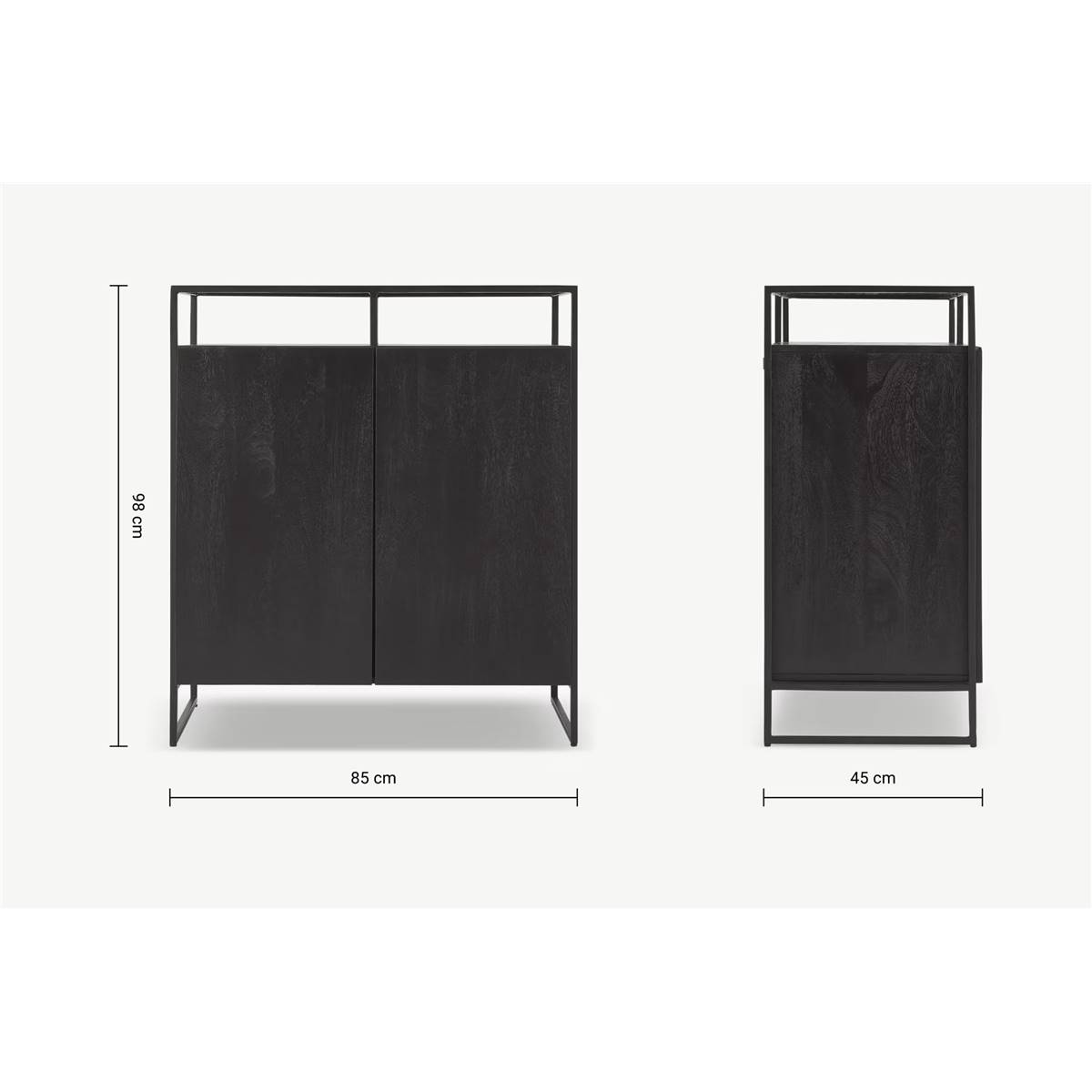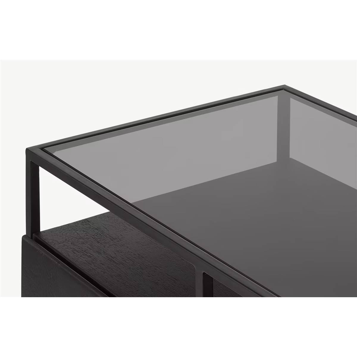 Le buffet en bois de manguier noir et plateau en verre fumé Kilby apporte une touche d'élégance moderne à votre intérieur. Avec sa combinaison de bois de manguier et de verre fumé, il offre une esthétique unique et un rangement polyvalent. Ses deux portes dissimulent une étagère traversante, idéale pour organiser vos affaires, tandis que la petite niche ouverte sous le plateau en verre ajoute un espace fonctionnel et visuellement léger.