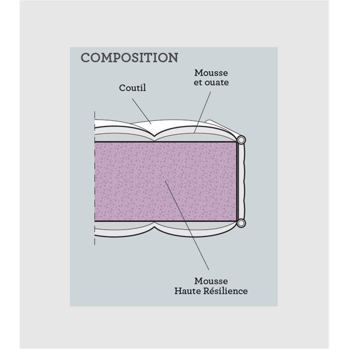 Le matelas est composé de mousse haute résilience d'une densité de 35kg/m3, garantissant un confort ferme et un accueil moelleux. Avec une épaisseur totale de 13 cm de mousse HR, il offre un soutien adapté et durable pour des nuits de qualité.