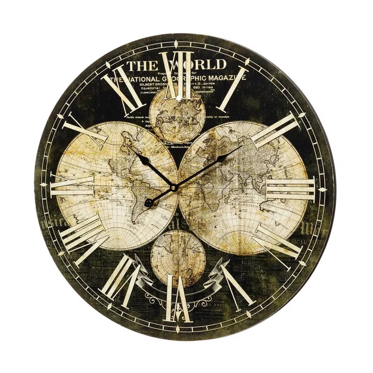 Gardez le rythme du temps tout en explorant le monde avec notre horloge murale ronde en bois noir. Dotée d'un fond illustrant une carte du monde, cette horloge apporte une touche d'aventure et de sophistication à votre décoration murale.