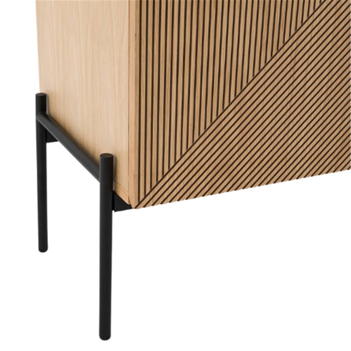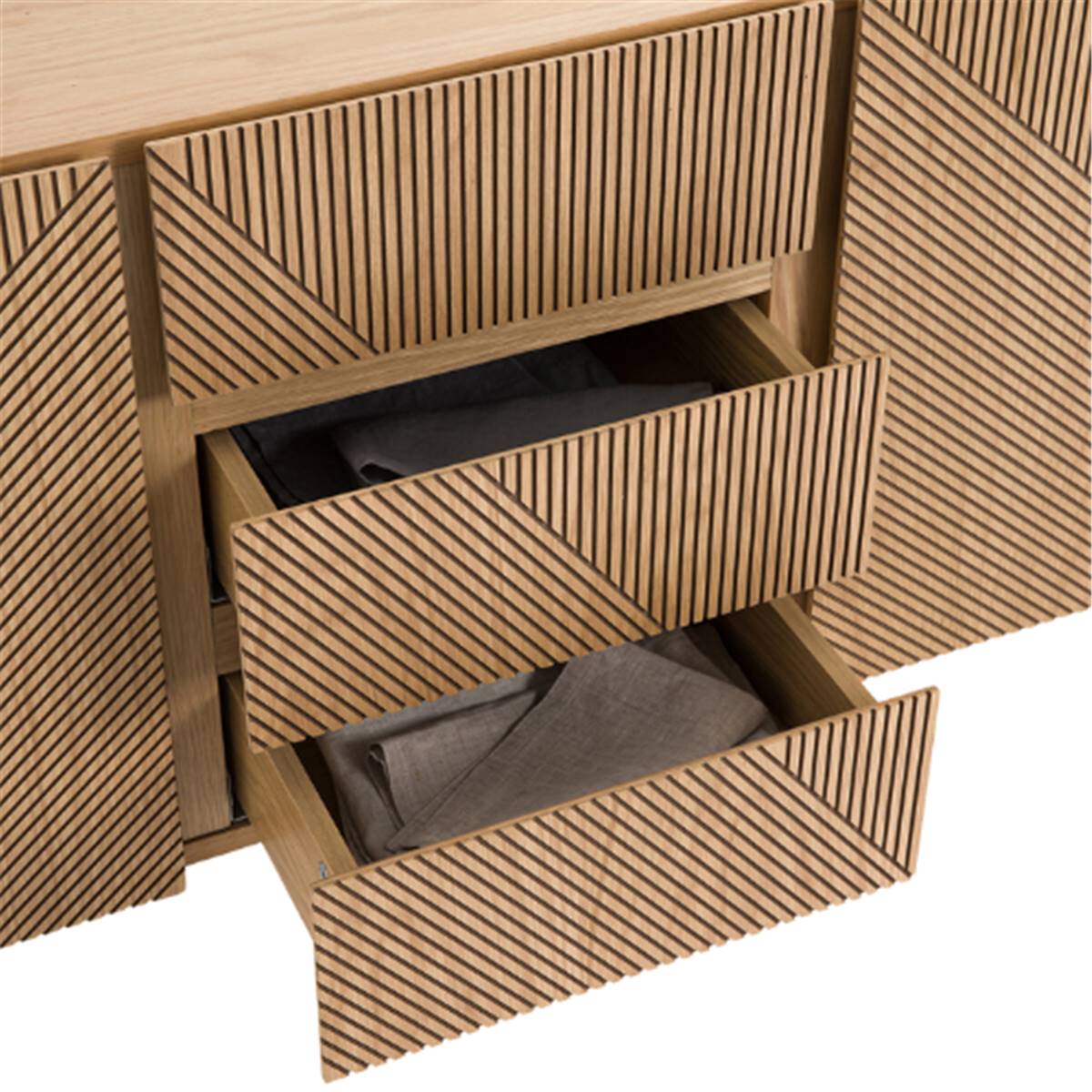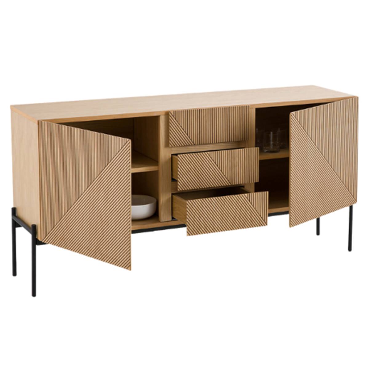 Ce buffet est fabriqué à partir de bois certifié FSC®, avec un caisson en MDF plaqué chêne et des finitions en vernis nitrocellulosique. Les portes et tiroirs sont également en MDF plaqué chêne, avec une épaisseur de 6 mm et une finition striée. Il dispose de deux portes avec des tablettes ajustables et amovibles, ainsi que de trois tiroirs avec une ouverture douce grâce à la technologie softclosing. Les pieds en métal sont ajustables et bénéficient d'une finition époxy pour plus de durabilité.