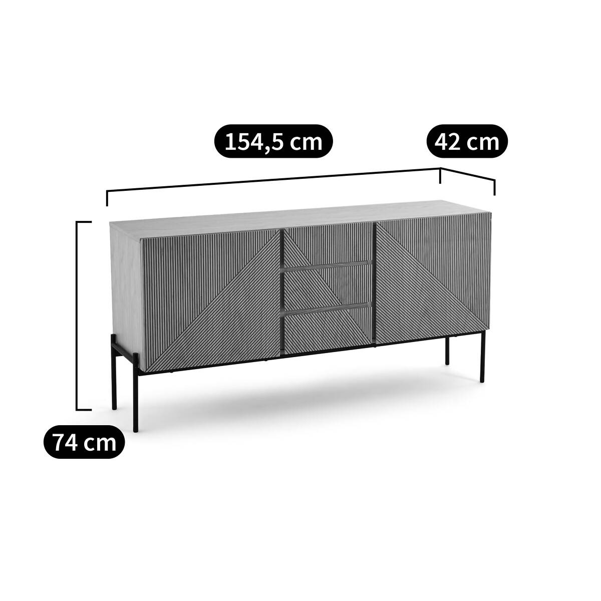 Le buffet Dolge combine parfaitement style vintage et fonctionnalité. Avec ses portes striées et ses tiroirs pratiques, il trouvera facilement sa place dans un salon ou une salle à manger, tout en apportant une touche sophistiquée et rétro à votre décoration.