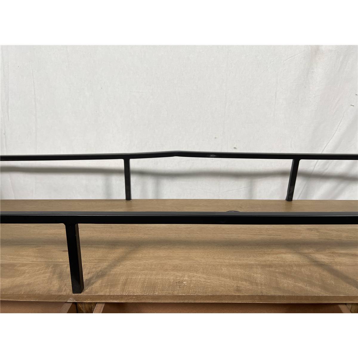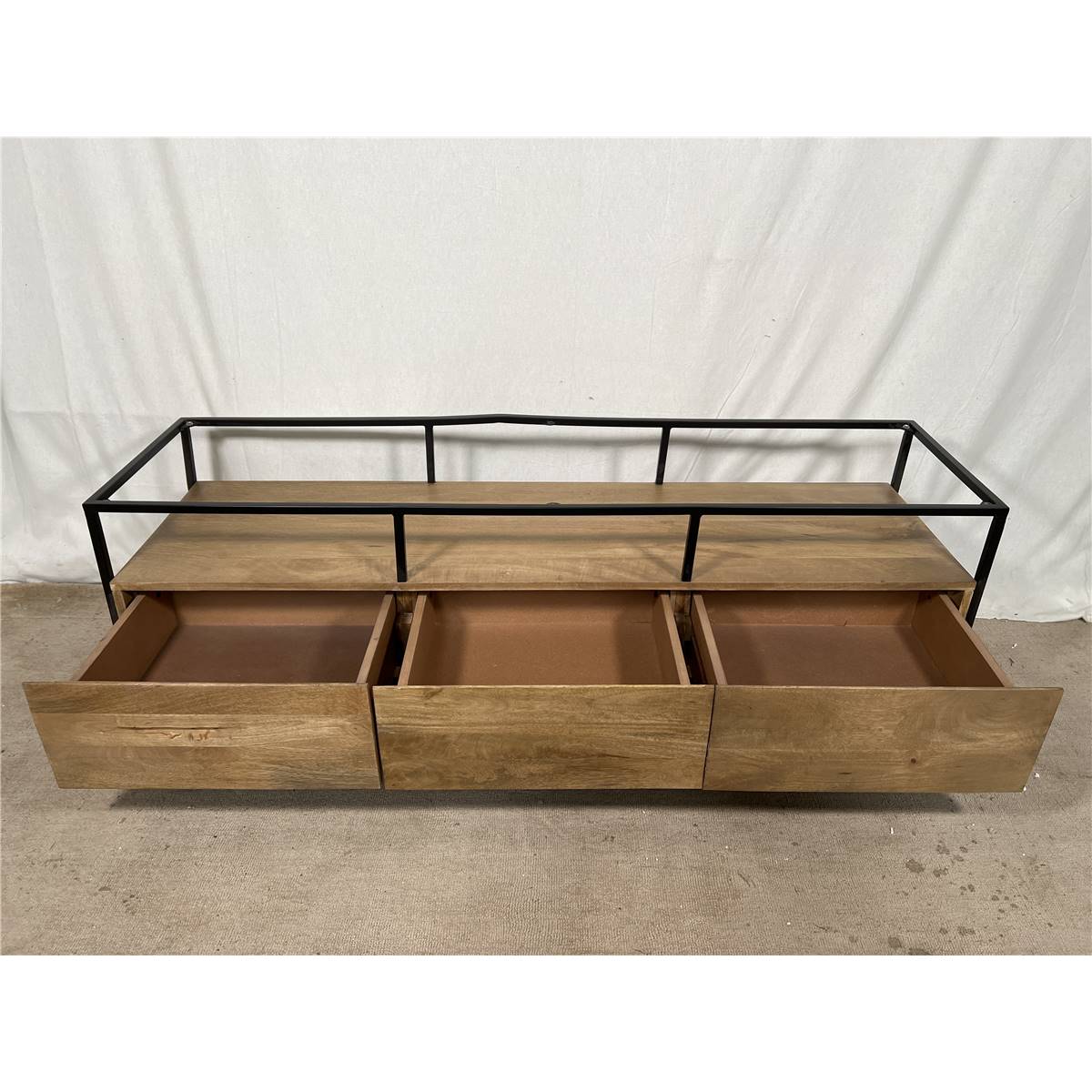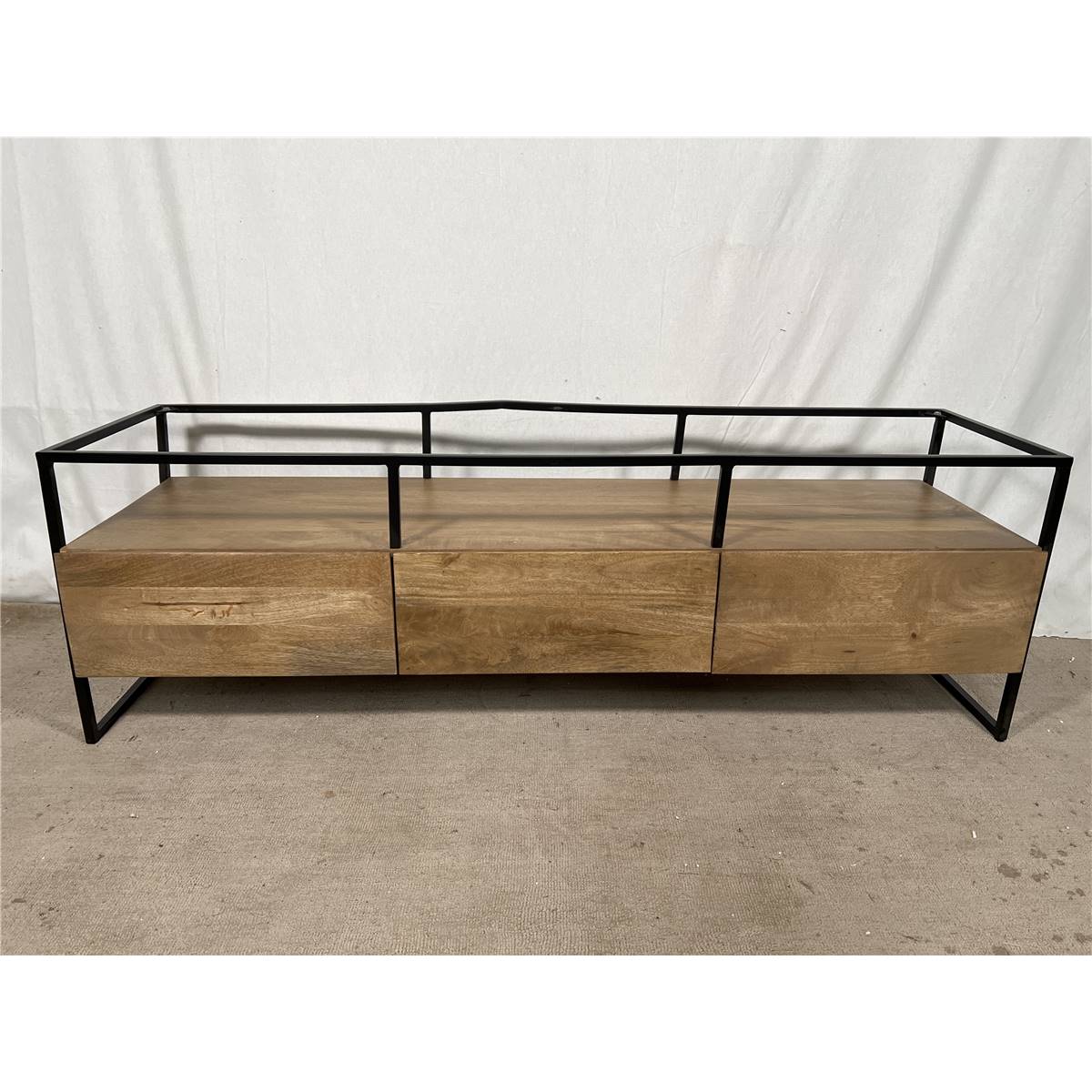 Grand meuble de télévision avec 3 tiroirs en bois de manguier clair et verre.