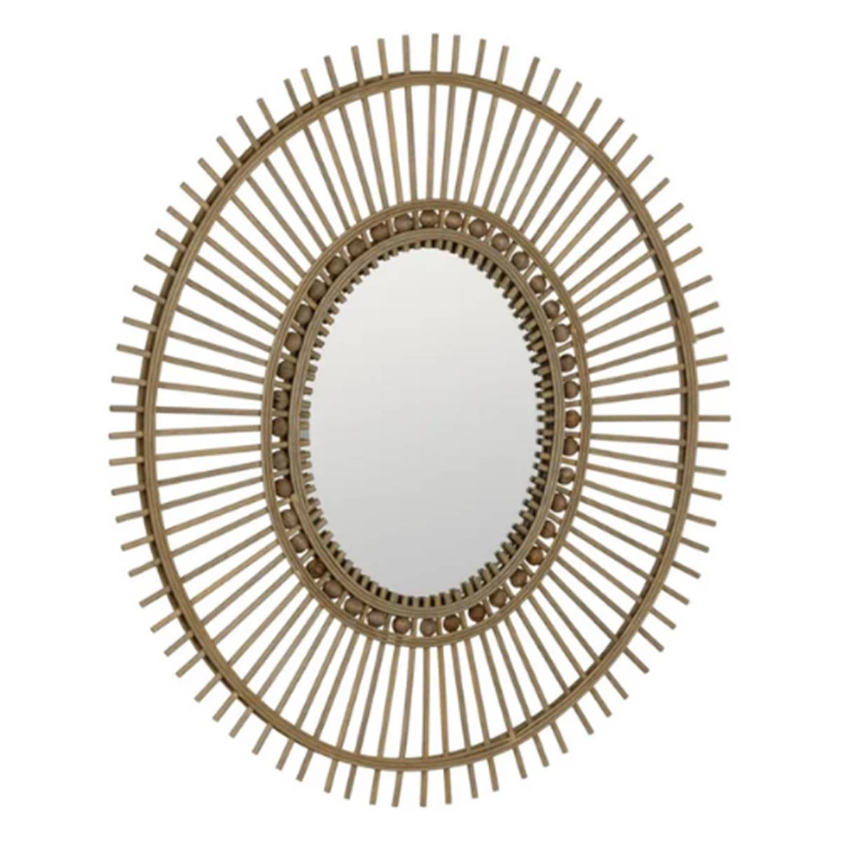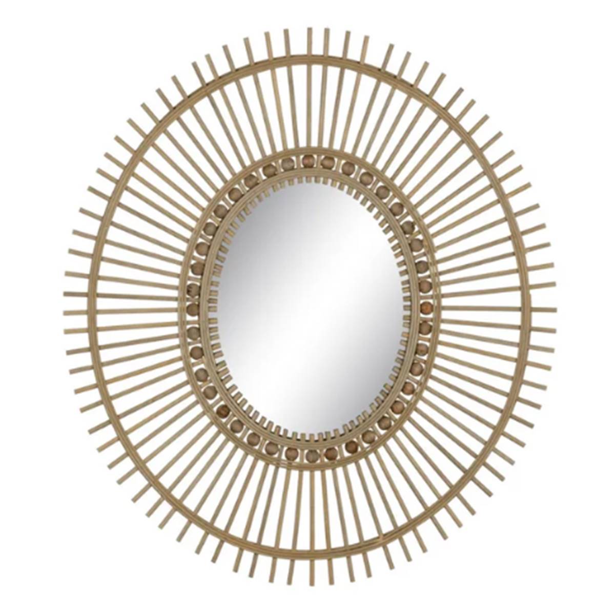 Charlie Miroir en bambou naturel, au style chaleureux et authentique, idéal pour compléter une décoration bohème. Dimensions : 67 × 3 × 77 cm. Poids : 2,5 kg.
