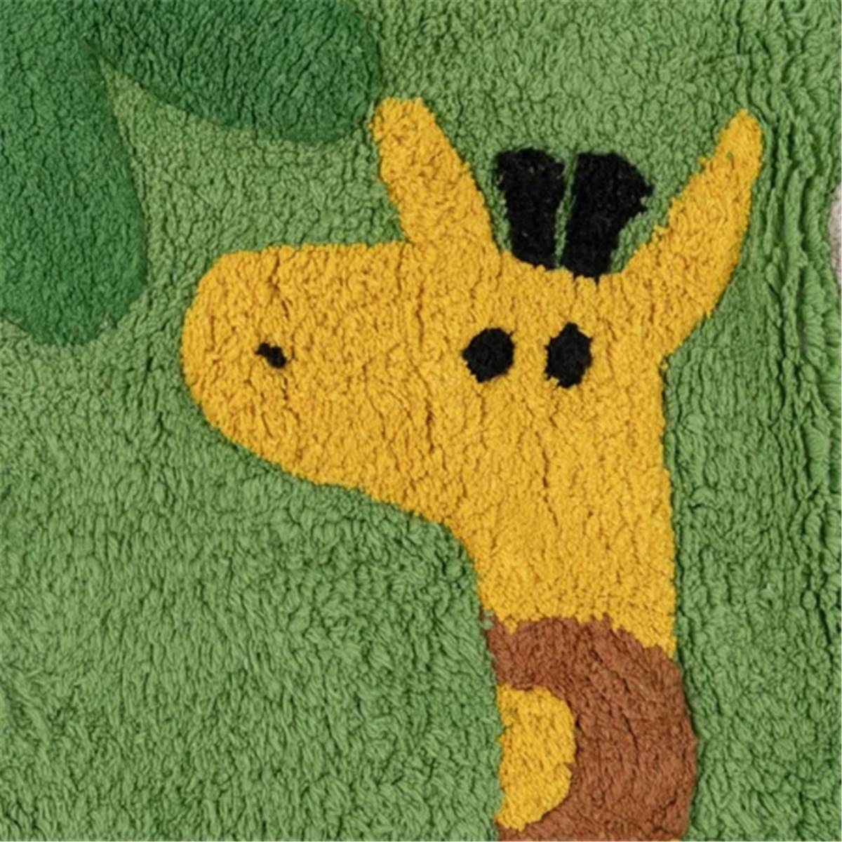 Suivre petit tapis en coton motif animaux, couleur vert, parfait pour apporter une touche ludique et douce à une chambre ou un espace de jeu. Dimensions : 135 × 100 cm. Poids : 2,9 kg.