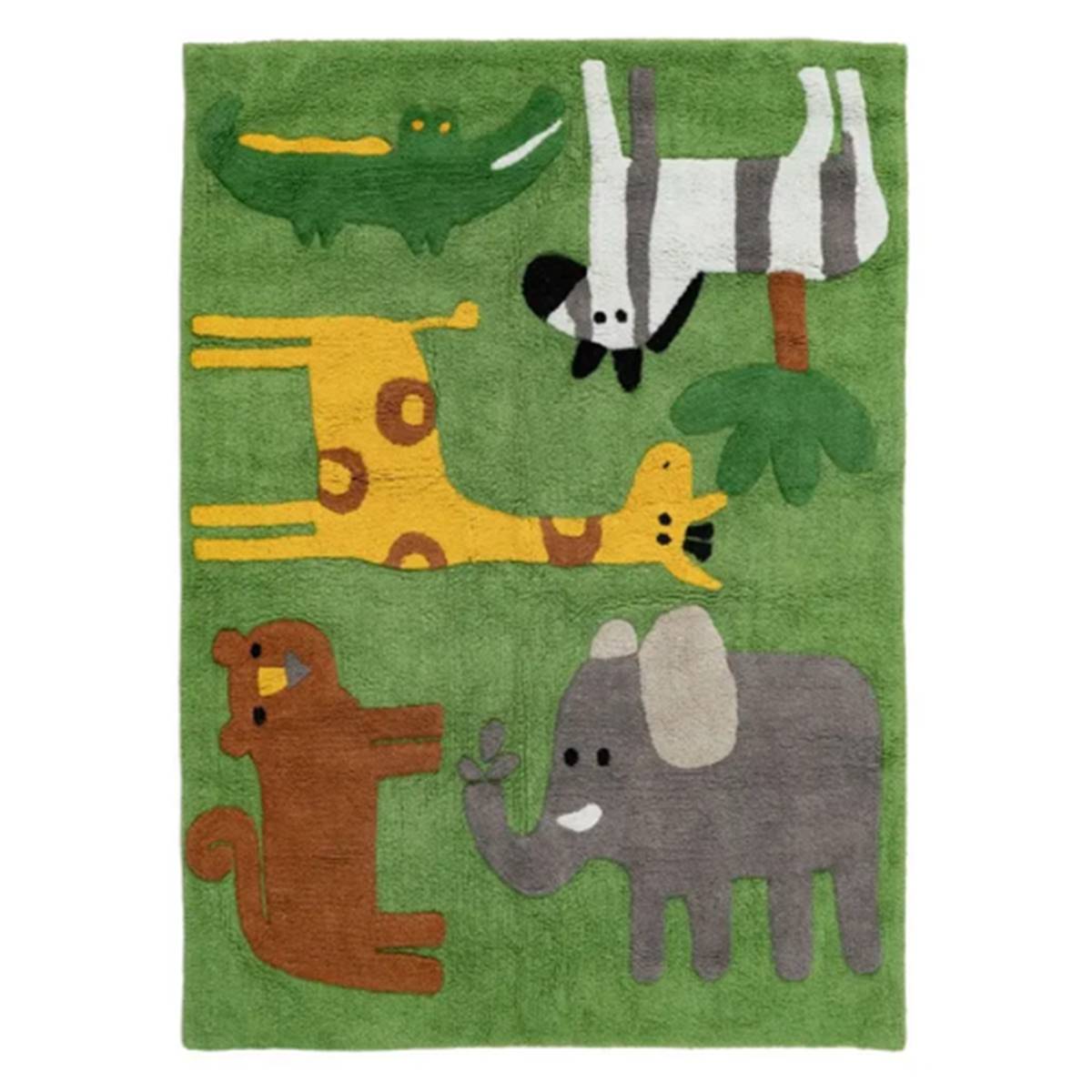 Suivre grand tapis en coton motif animaux, couleur vert, parfait pour apporter une touche ludique et douce à une chambre ou un espace de jeu. Dimensions : 160 × 120 cm. Poids : 3.8 kg.