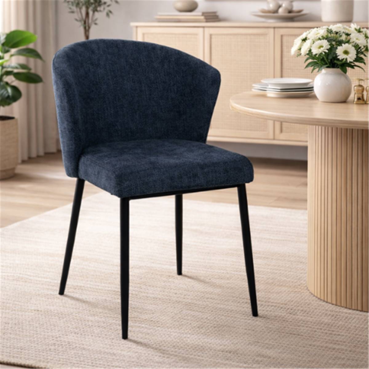 La chaise Bardo dossier incurvé en tissu bleu et pieds métal combine confort et style moderne pour votre salle à manger ou espace repas. Son assise et son dossier rembourrés, recouverts d’un tissu polyester de teinte bleue, offrent un confort agréable au quotidien. Sa structure en métal assure stabilité et robustesse, tandis que son dossier incurvé épouse naturellement la forme du dos. Son design contemporain permet de l’intégrer facilement dans différents styles d’intérieur.