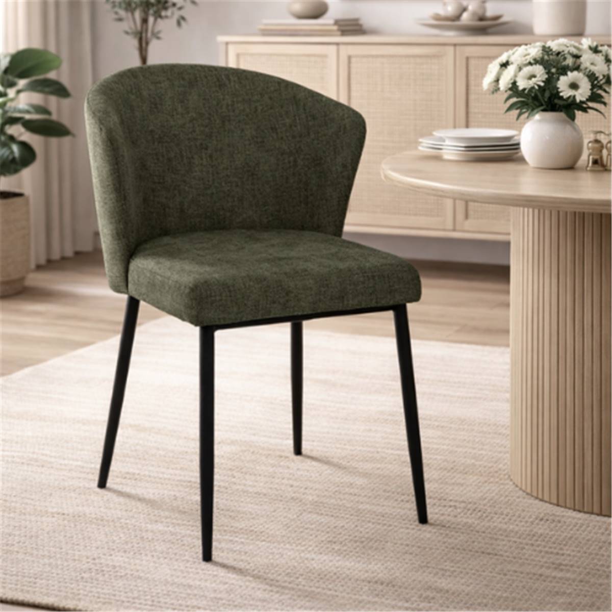 La chaise Bardo dossier incurvé en tissu vert et pieds métal combine confort et style moderne pour votre salle à manger ou espace repas. Son assise et son dossier rembourrés, recouverts d’un tissu polyester de teinte verte, offrent un confort agréable au quotidien. Sa structure en métal assure stabilité et robustesse, tandis que son dossier incurvé épouse naturellement la forme du dos. Son design contemporain permet de l’intégrer facilement dans différents styles d’intérieur.