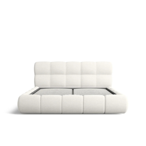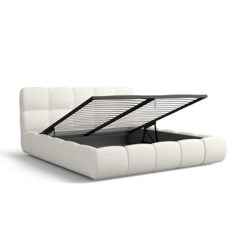 Le lit Lorea 160x200 en tissu texturé blanc offre un design élégant et un grand espace de rangement intégré pour optimiser votre chambre avec style.
