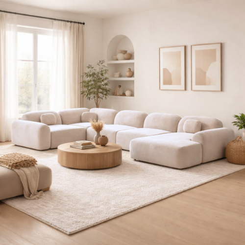 Le canapé panoramique d’angle droit Buccana en tissu velours crème incarne l’équilibre parfait entre confort d’accueil et style contemporain. Grâce à son format généreux, il invite à la détente tout en structurant élégamment l’espace salon.