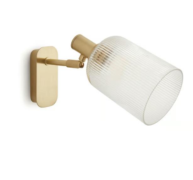 Elle dispose d’un abat-jour orientable en verre strié et d’une structure en fer laitonné, compatible avec une ampoule LED E14 de 4W max (non fournie)..