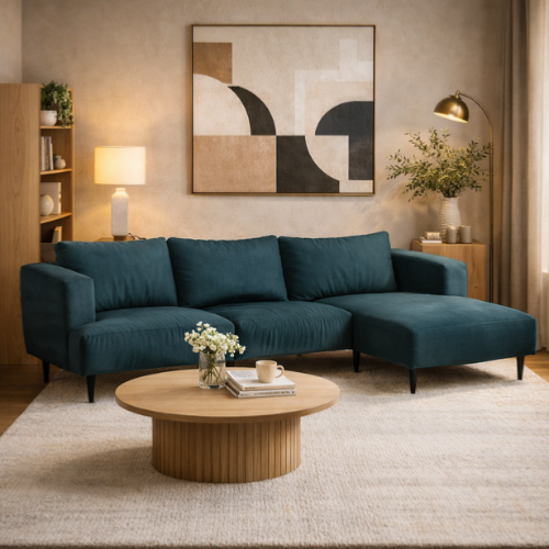 Ajoutez une touche d'élégance et de sophistication à votre salon avec ce magnifique canapé d'angle droit en velours bleu pétrole. Ce canapé allie style moderne et confort luxueux, faisant de lui la pièce maîtresse idéale pour tout intérieur contemporain. Ce canapé est revêtu d'un velours de haute qualité, doux au toucher et offrant une belle brillance. Le velours bleu pétrole apporte une profondeur de couleur riche et un aspect somptueux à votre espace de vie. Conçu avec une disposition en angle gauche, ce canapé maximise l'utilisation de l'espace, offrant une grande capacité d'assise sans encombrer la pièce. Le côté le plus long du canapé est à gauche lorsque vous êtes face à lui. Le velours est un matériau résistant, mais il est conseillé de l'aspirer régulièrement pour enlever la poussière et d'éviter l'exposition directe à la lumière du soleil pour préserver la couleur. Les petites taches peuvent être nettoyées à l'aide d'un chiffon humide. Le velours bleu pétrole apporte une touche de luxe intemporel qui s'harmonise parfaitement avec divers styles de décoration, du moderne au classique. L'angle gauche est idéal pour délimiter un espace dans une grande pièce ou pour s'adapter parfaitement dans un coin. Ses pieds noir soutiennent le tout. Le canapé sans méridienne à une profondeur de 158 cm et sans : 99 cm.