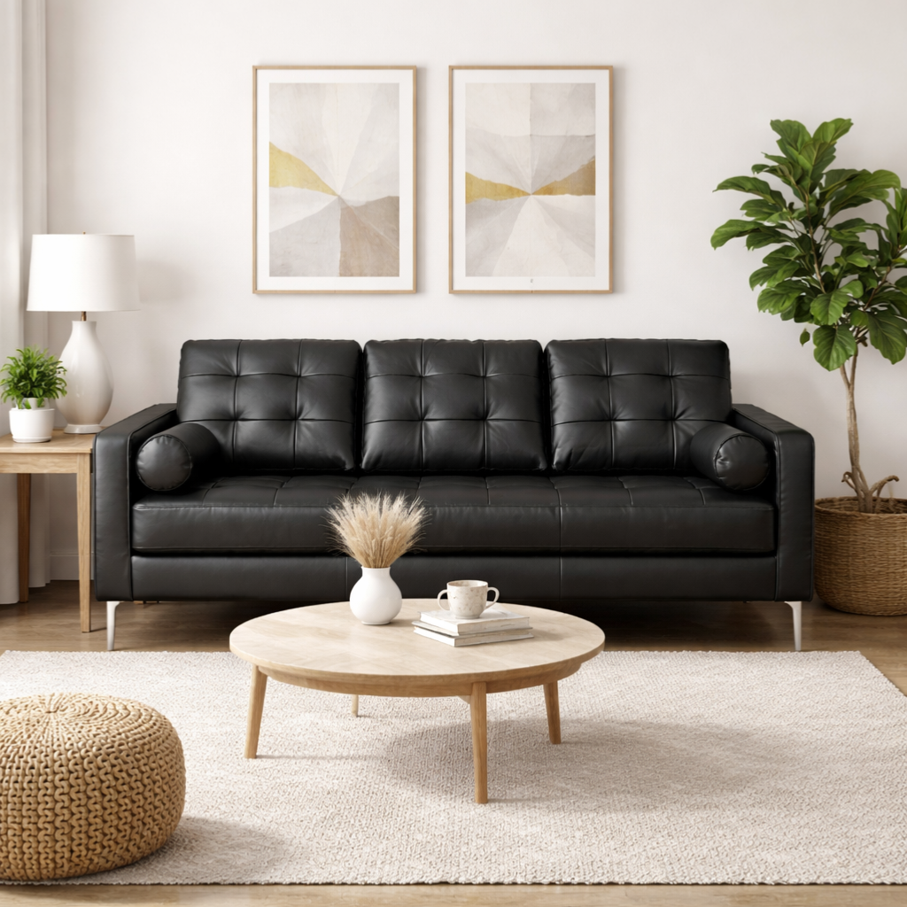 Avec son cuir capitonné, ce généreux canapé droit est un appel à la détente.