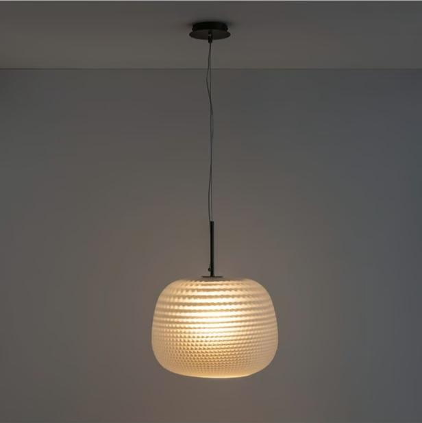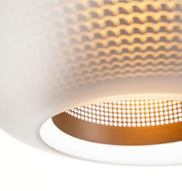 Son design joue sur les contrastes : allumée, elle révèle un motif en relief et diffuse une lumière douce et graphique ; éteinte, elle s’intègre avec discrétion et apporte une touche contemporaine à l’espace.