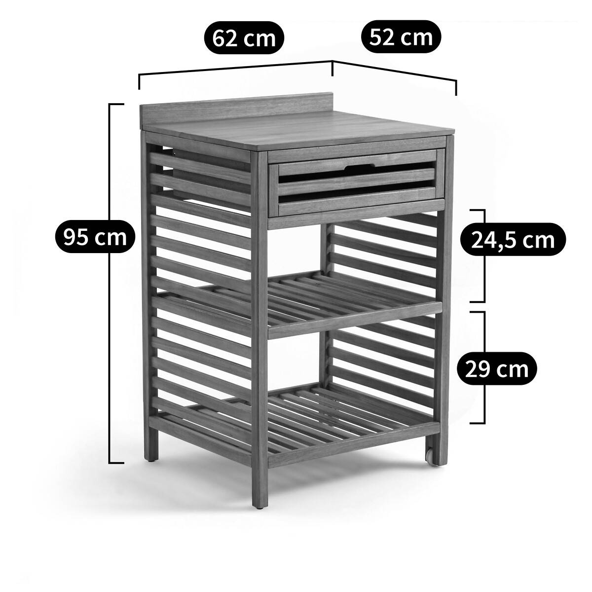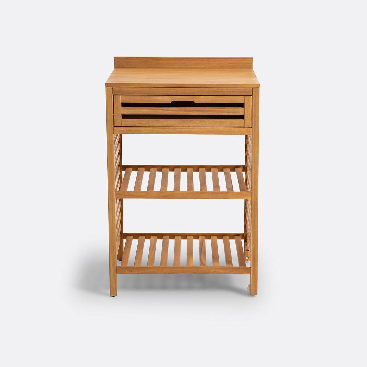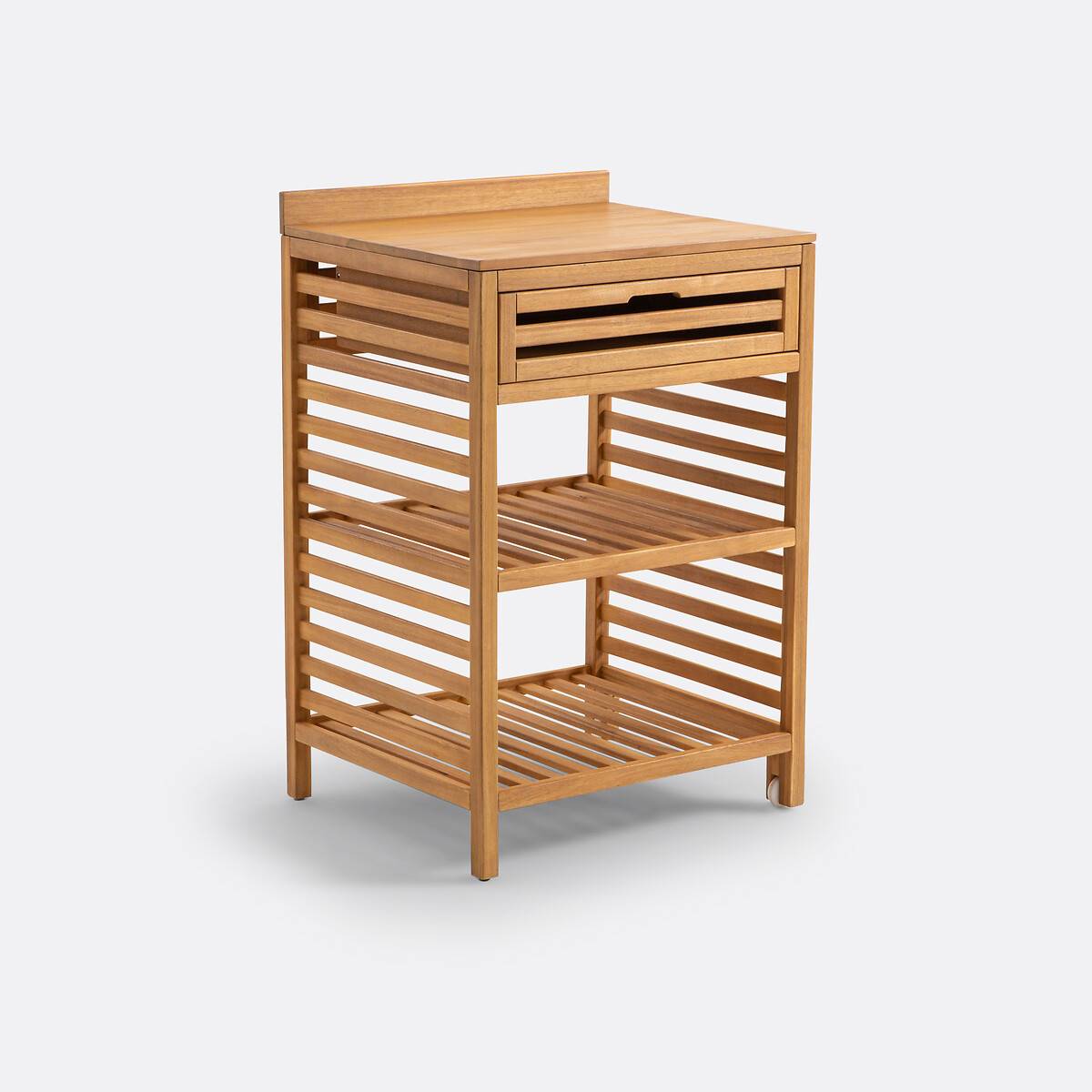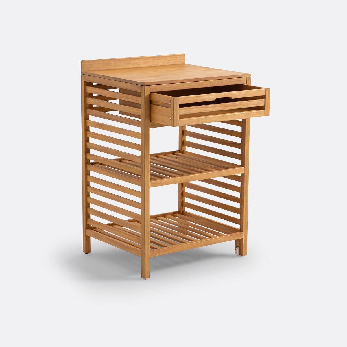 Polyvalent et pratique, ce meuble d’appoint s’adapte à tous les usages : desserte pour le barbecue, meuble de rangement extérieur ou encore support pour plantes. Doté de deux étagères ajourées et d’un tiroir spacieux, il offre un bel espace de rangement, tandis que ses roulettes facilitent son déplacement entre la terrasse, la véranda ou le jardin d’hiver..